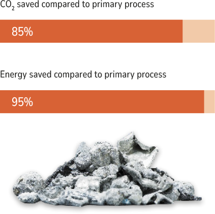 Worldwide, 75% of all aluminium that has ever been mined is still in circulation. Compared to manufacturing aluminium from bauxite, recovering aluminium is much better for the environment, uses far less energy and generates far fewer emissions. Every tonne of recycled aluminium saves eleven tonnes of CO2.